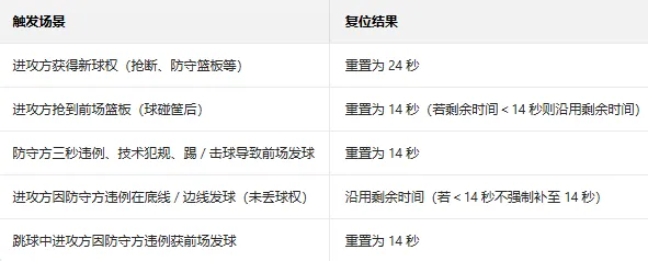 误区 2:“进攻篮板必回24秒”→ 仅回14秒,剩余>14秒时不重置。